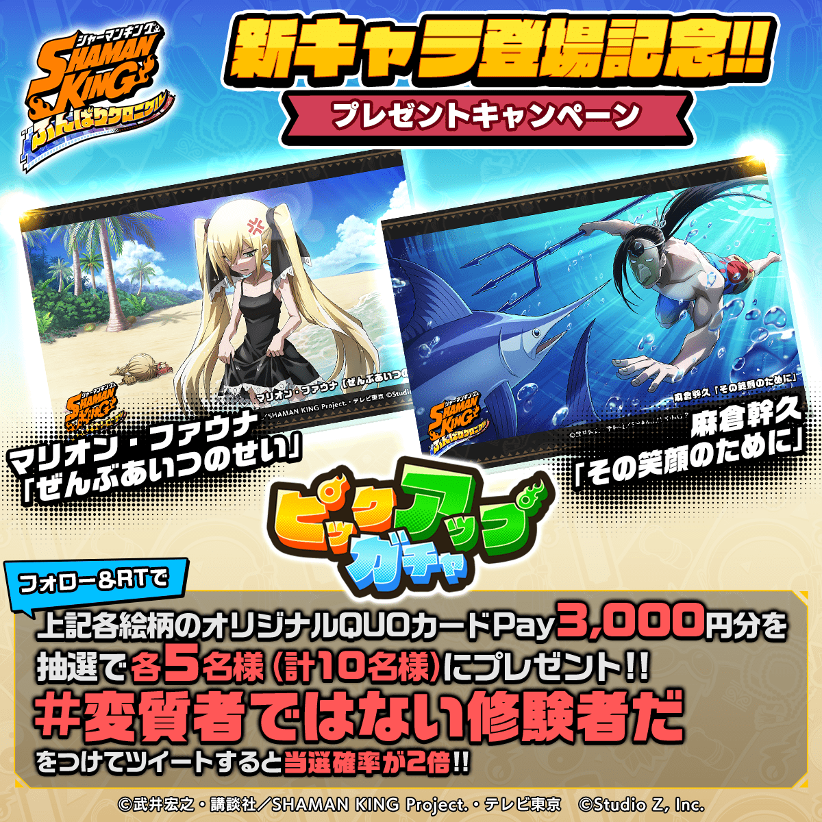 Studio Z株式会社(本社:東京都港区、代表取締役CEO:池幡賢)は、好評配信中のTVアニメ『SHAMAN KING(シャーマンキング)』を題材とした初のスマートフォン向けアプリゲーム『SHAMAN KING ふんばりクロニクル(通称:ふんクロ)』が、メインストーリーの8章を追加いたしました。記念して、期間限定ミッションやログインボーナスを開催いたします。また、マリオン・ファウナや麻倉幹久がGET出来るイベントガチャの他、麻倉幹久とファウストVIII世を強化できるクロニクルボードを解放いたします。オリジナルQUOカードPayが当たるキャンペーンもございますので、是非、ご参加ください。