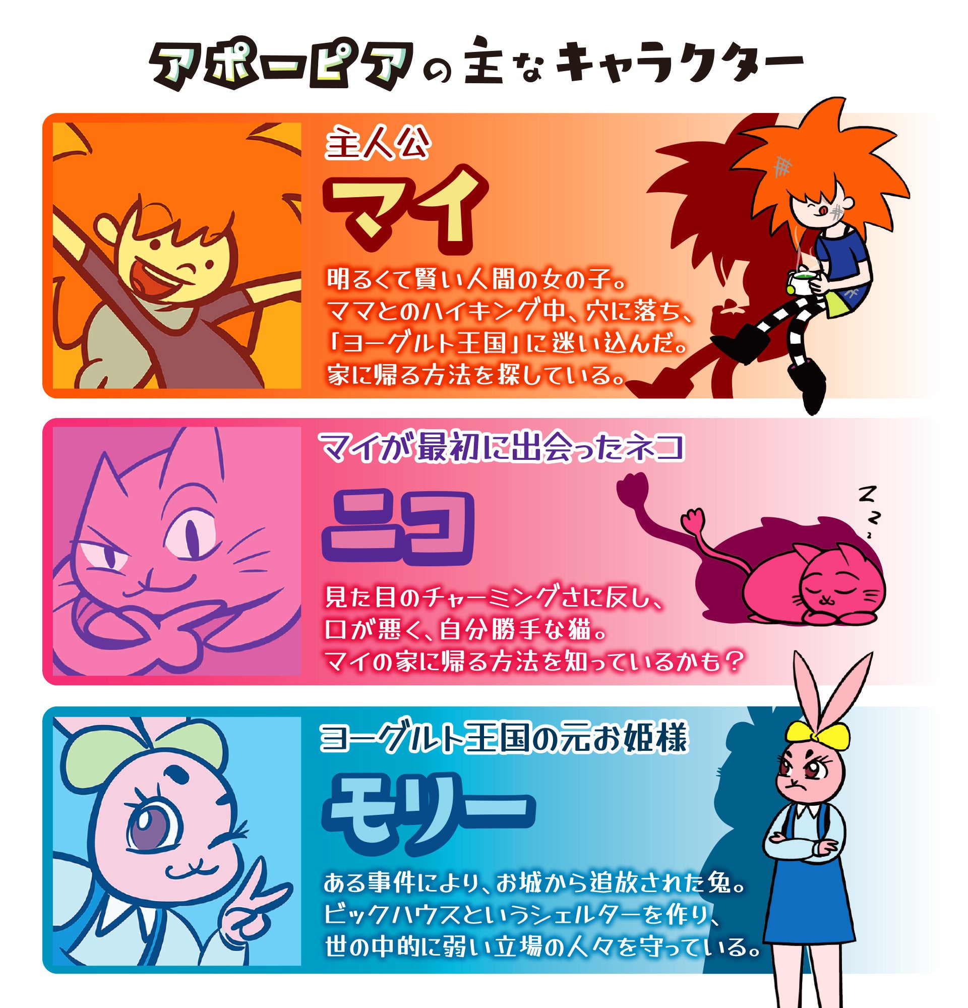 Apopia = Apocalypse(世の終末) × Utopia(理想の世界) を掛け合わせ表現した言葉で、人間の少女マイが絶望から理想を求め這い上がる姿を描いた物語です。