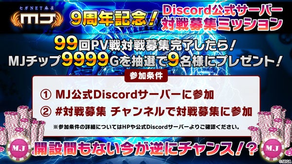 Discordの相手募集チャンネルで99回の対戦募集が完了後、抽選で9名様に「MJチップ9999G」をプレゼントします。ぜひご参加ください!