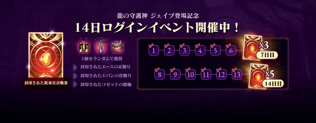 イベント期間中にゲームへログインするだけで、伝説強化石や伝説装身具などの貴重なアイテムがもらえます。7日目と14日目には「封印された装身具召喚券」を獲得できますので、ぜひ毎日ログインして手に入れてください。