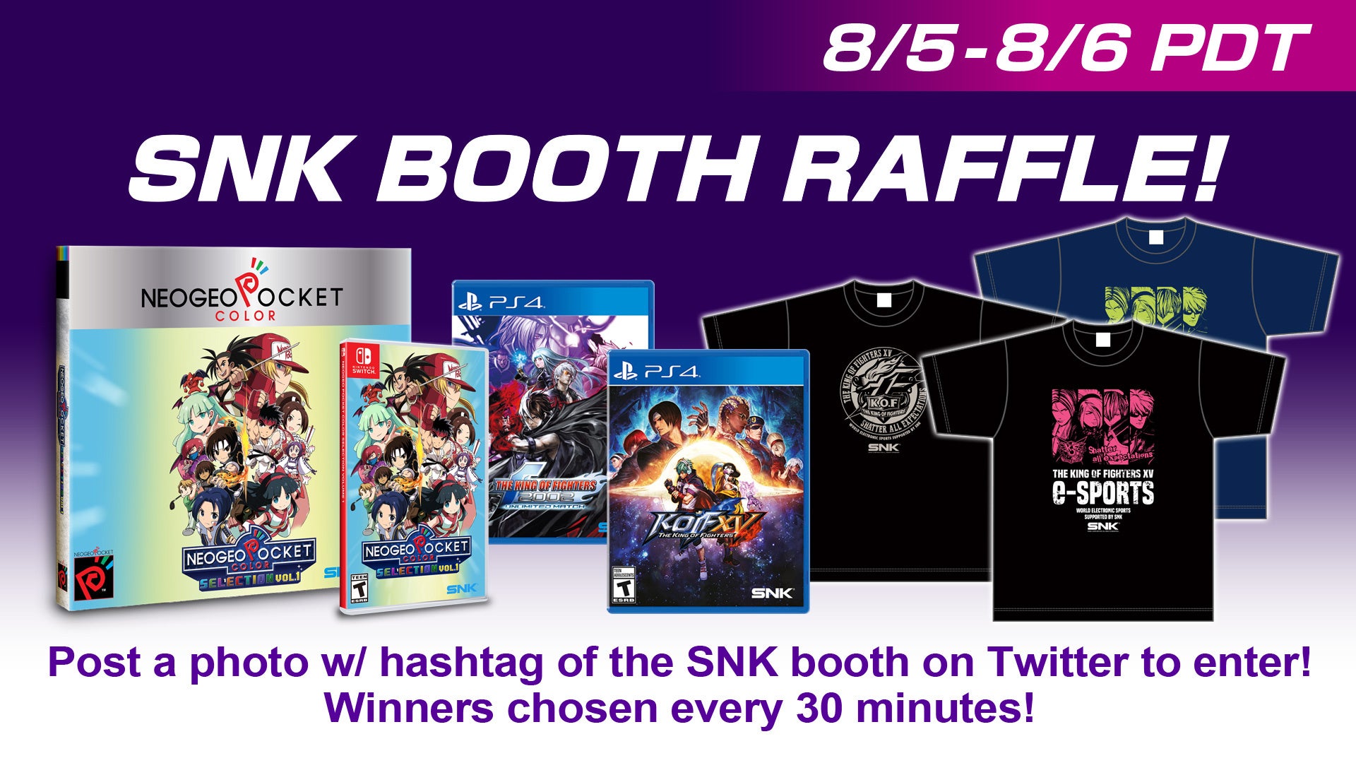 フォトコーナーで撮影した写真に、ハッシュタグ#SNKEVOを付けてTwitterに投稿すると、限定版ゲームソフトやKOF XV オリジナルTシャツなどを抽選でプレゼント。さらに応募者にEVO限定グッズをプレゼント。ぜひご参加ください。