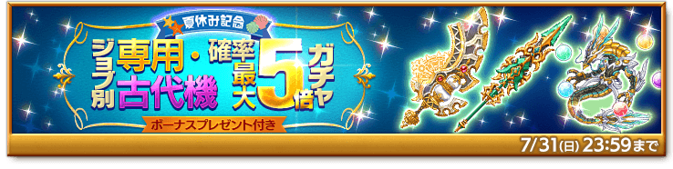 <戦力を手に入れる大チャンス!「ジョブ別 夏休み記念 専用・古代機確率最大5倍ガチャ」販売中!>