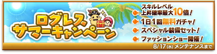 期間限定武器「アラハバキ」「常夏アイス」「お祭りゼウス」がラインナップした「1日1回無料!サマーガチャ」や限定装備セット、スキルレベル上昇確率10倍など、夏を盛り上げる催しが目白押し!