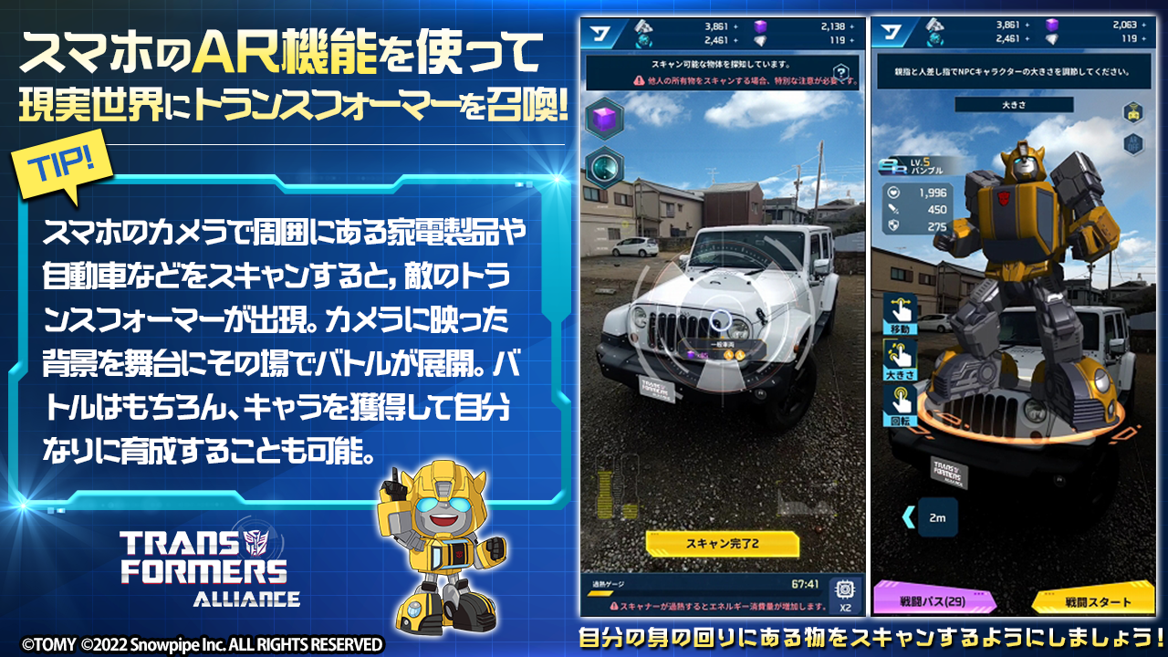 スマートフォンやタブレットのカメラで周囲にある家電製品や自動車などをスキャンすると、敵のトランスフォーマーが出現。迫力の3DバトルやAR機能が楽しむことができます。