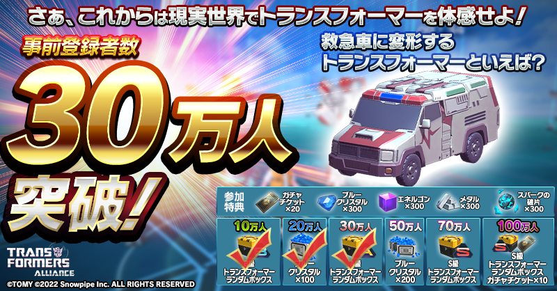 また、事前登録も30万人を突破し「A級トランスフォーマーランダムボックス」の追加支給が確定いたしました。