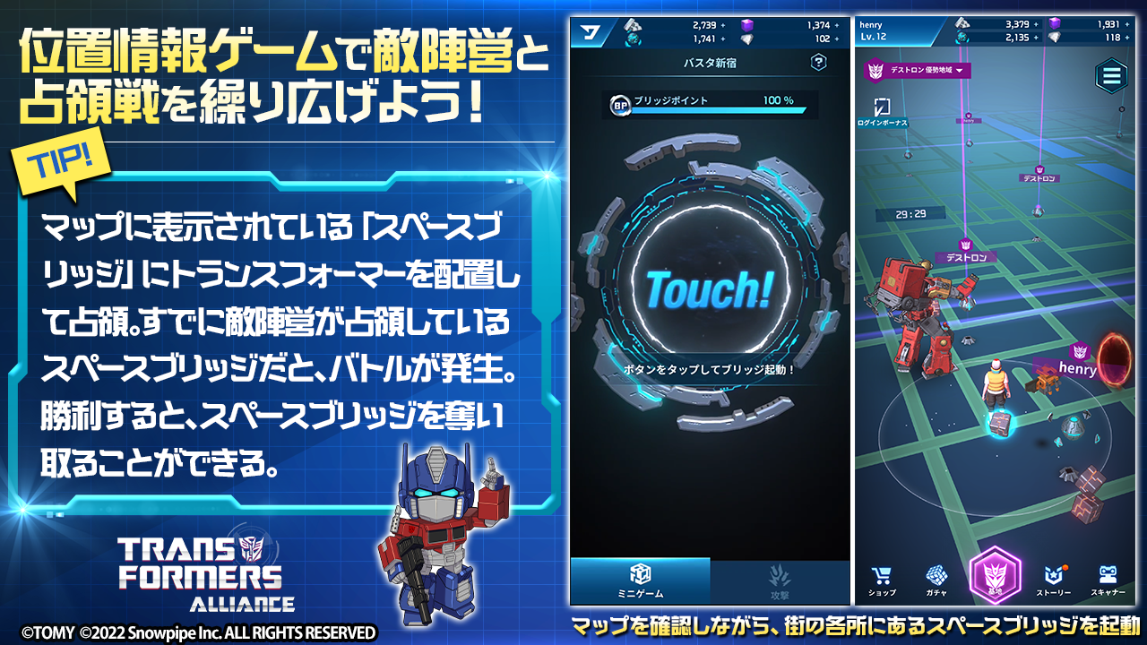 位置情報サービスを使用した敵陣営との占領戦。マップを見ながら自分の足で街を歩き、仲間のトランスフォーマーをあちこちにある「スペースブリッジ」に配置して占領。すでに敵陣営が占領しているスペースブリッジにアクセスすると、バトルが発生。勝利するとスペースブリッジを奪い取ることができます。
