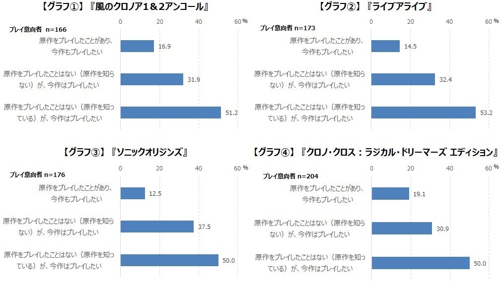 今回調査した4タイトルでは、いずれのタイトルでも「原作をプレイしたことはない(原作を知っている)が、今作はプレイしたい」という回答がもっとも多い結果になりました。理由を聞いてみると「原作をプレイしたことは無いが、シナリオの評判がいいので気になっている。」(31歳/女性)など、原作をプレイしていないゲーマーにも、タイトル認知だけではなくゲームの内容に関する情報が認識されていることがわかります。