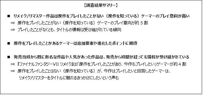 このようにリメイク/リマスターされる著名なゲームは、原作を知らない、プレイしていない層にも興味/関心を持たれていることがわかります。原作ファンは“進化”を期待しており、一方で、原作を知らない層は“新作タイトル”として受け入れ、期待しているという姿がうかがえる結果となりました。