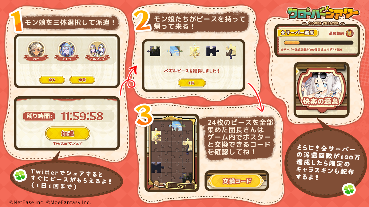 モンスター娘派遣キャンペーンの参加方法は超簡単!モン娘3体を選んで派遣に送るとピースを持って帰ってきます。ピースを使いパズルが完成するとゲーム内のアイテムと交換することができます。ぜひ公式サイト(https://www.clovertheater.jp/)をチェックしてみてください。