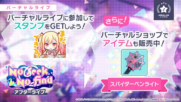 また、「No seek No find アフターライブ」の開催に先立ち、7月21日(木)からバーチャルショップにて、ペンライト「スパイダーペンライト」を販売中です。