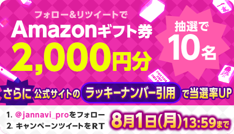 2022年7月22日(金)よりオンライン麻雀アプリ「ジャンナビ麻雀オンライン」twitter公式アカウントにて抽選でamazonギフト券2000円分を10名様にプレゼントするキャンペーンを実施いたします。