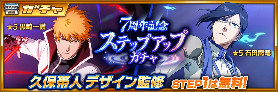久保帯人デザイン監修キャラクター黒崎一護(7周年記念ver.)と石田雨竜(7周年記念ver.)が登場するステップアップガチャを開催!