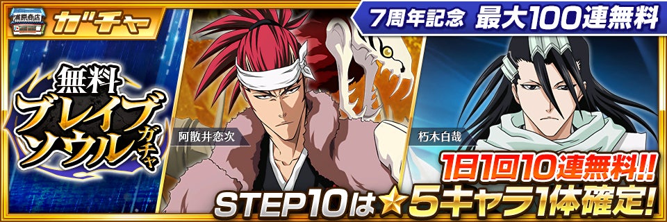 本キャンペーンでは、7周年キャラクターの黒崎一護と石田雨竜が登場するガチャや、最大100連の無料ガチャをはじめとした豪華キャンペーンを実施します。