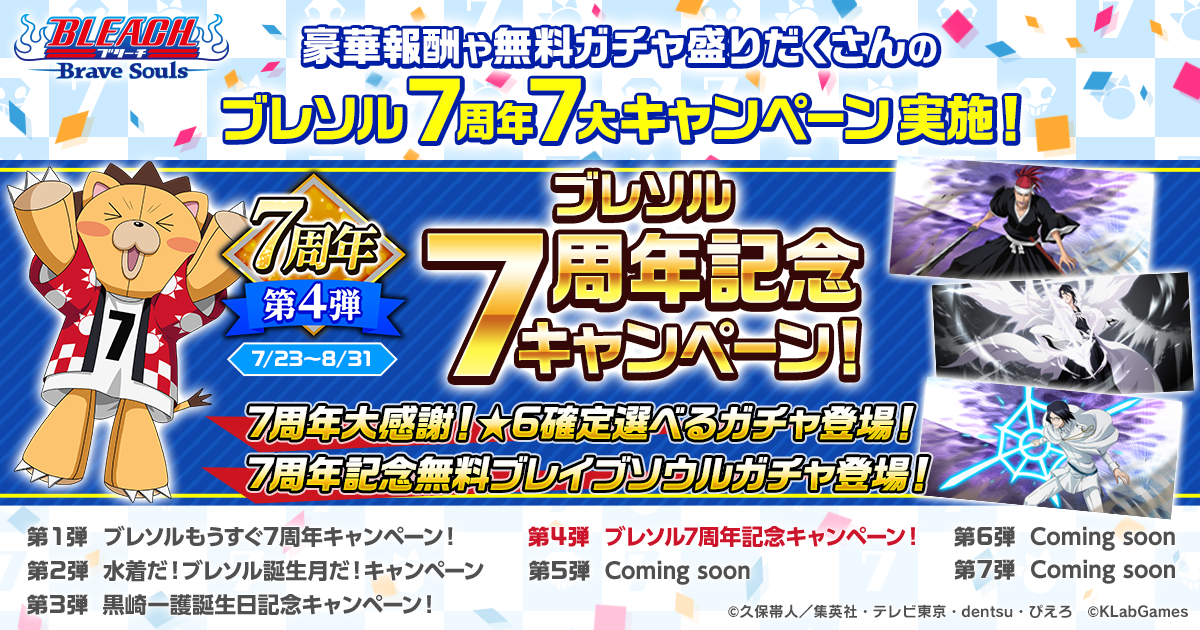 本キャンペーンでは、7周年キャラクターの黒崎一護と石田雨竜が登場するガチャや、最大100連の無料ガチャをはじめとした豪華キャンペーンを実施します。