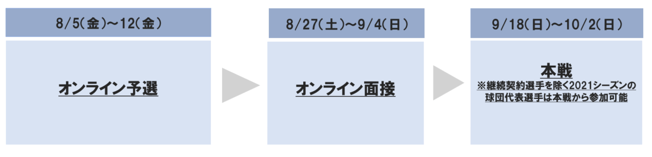 8月5日から12球団ごとに行われるオンライン予選で、上位13~15名がオンライン面接に進みます。各球団で行われるオンライン面接を通過した候補選手と、継続契約選手を除く2021シーズンの球団代表選手の計12名が9月下旬~10月上旬に行われる本戦に進出。勝ち抜いた上位2名が球団代表選手となります(継続契約選手がいない場合は、上位3名)。