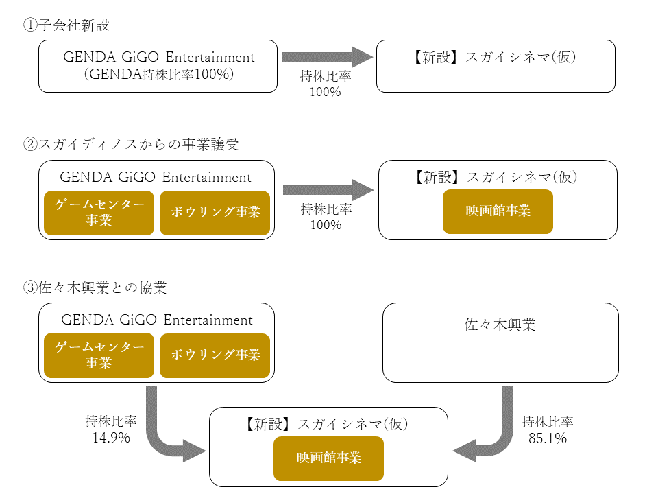 まず、GENDA GiGO Entertainmentが100%出資する株式会社スガイシネマ(仮称、以下スガイシネマ)を設立いたします。次に本年9月30日付で、スガイディノスよりゲームセンター事業およびボウリング事業をGENDA GiGO Entertainmentが譲り受け、映画館事業をスガイシネマが譲り受けます。同日に、佐々木興業がGENDA GiGO Entertainmentからスガイシネマの株式の85.1%を取得いたします。