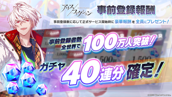 全世界で事前登録者が100万人を突破したことを記念し、プレイを開始した人全員に「ガチャ40連分」相当の12,000クォーツをプレゼントいたします。