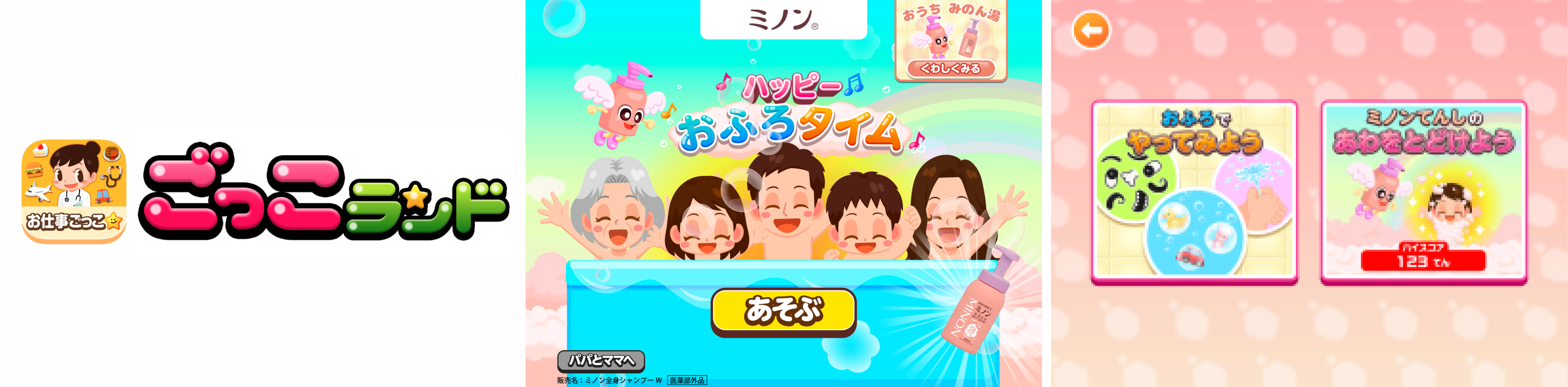 本ゲームを協賛する第一三共ヘルスケア株式会社(以下「第一三共ヘルスケア」)の「ミノン」は、赤ちゃんから高齢の方まで、敏感肌にかかわるすべての方の悩みに寄り添いたいという考えのもと、やさしさにこだわった製品づくりを行うスキンケアブランドです。子どもたちにお風呂に入る楽しさや正しくからだを洗うことの大切さを伝え、スキンケアを身近に感じていただきたいという想いから、『ごっこランド』への出店が実現しました。