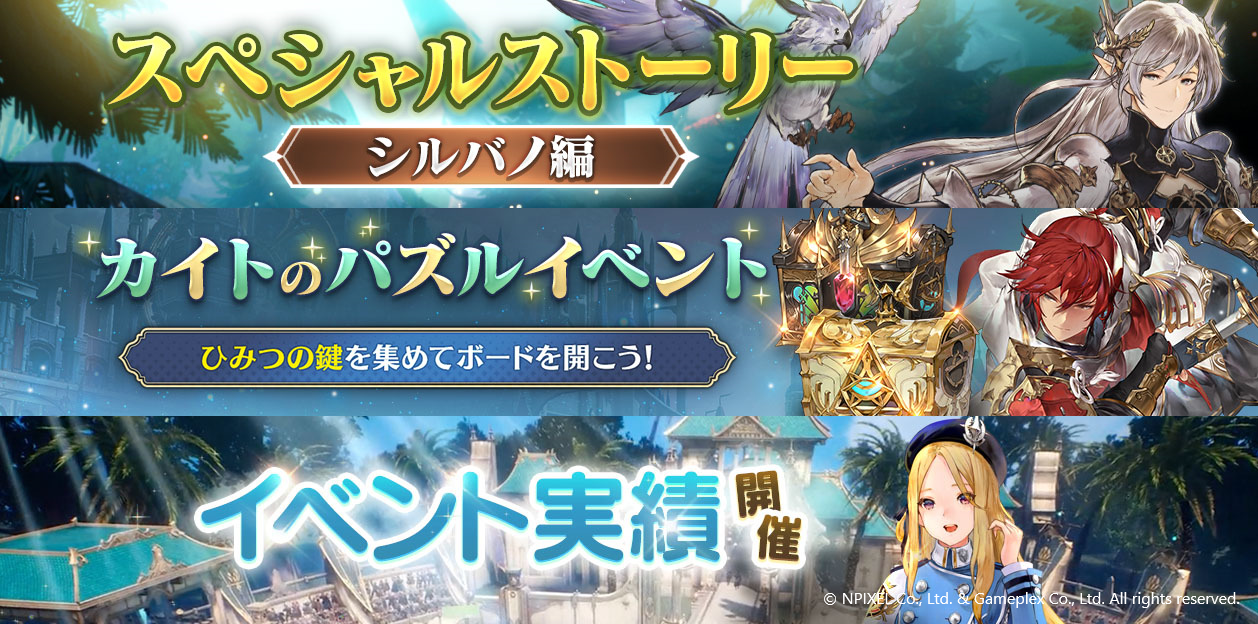 「スペシャルストーリー シルバノ編」や「カイトのパズルイベント」など、本日のアップデートよりイベントを多数開催しております!なお、各イベントの開催期間や内容詳細に関してはゲーム内にてご確認ください。
