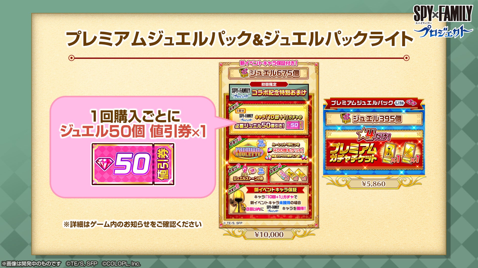 今回、「ロイド」「アーニャ」「ヨル」いずれか一人のモードチェンジができるようになる「コラボ衣装キャラ特別交換券」が付いた「ジュエルパック」をご用意いたしました。