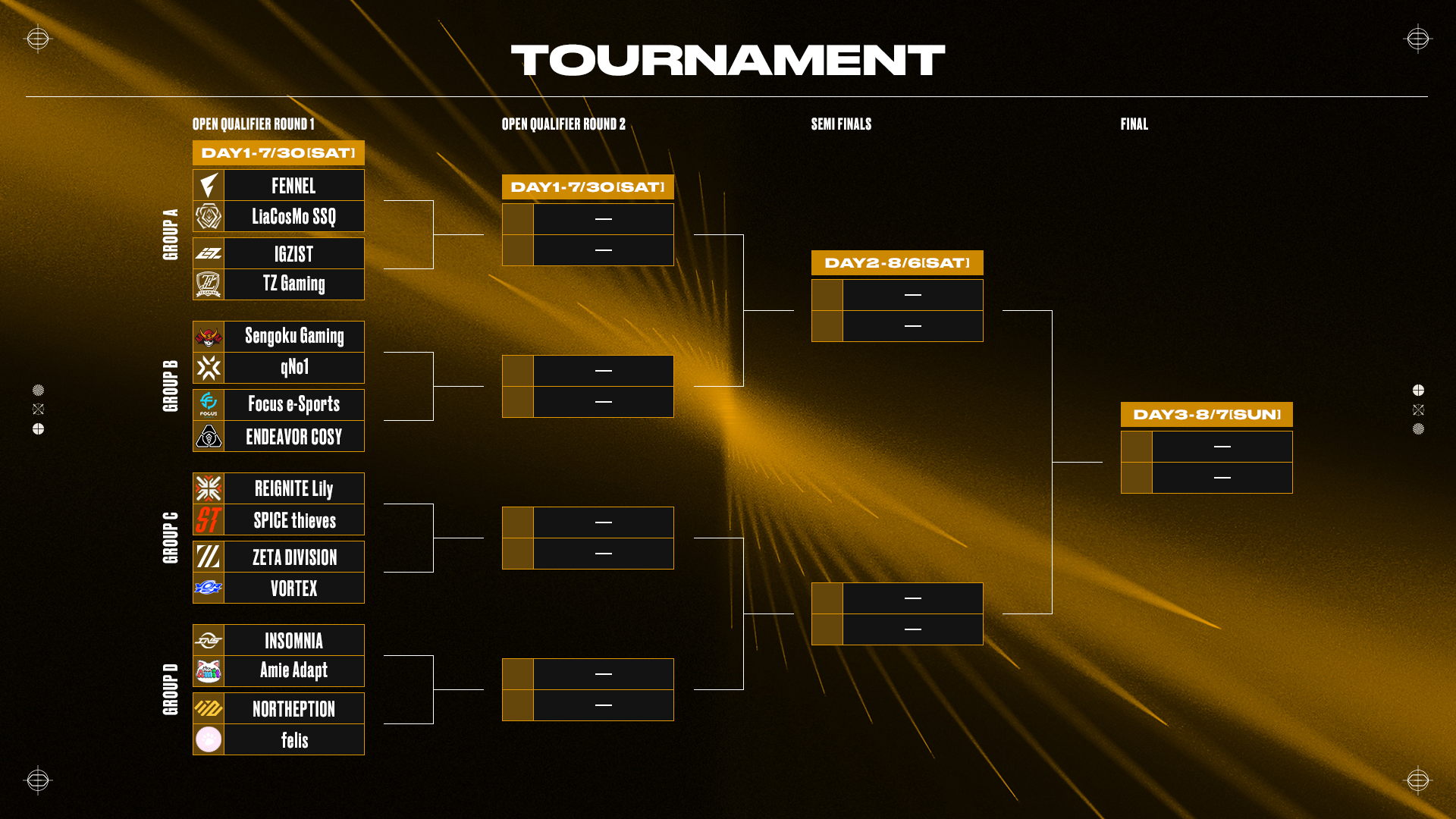 「VCT GAME CHANGERS JAPAN」は、日本初開催となる女性限定の公式大会です。本大会には、全16チームが出場し、シングルエリミネーション方式でトーナメントを実施します。7月30日(土)のOpen Qualifierでは、全試合BO1で実施し、各ブロックの上位1チーム(合計4チーム)が8月6日(土)に行われるSemi Finalsへ進出します。Semi Finalsでは、全試合BO3で実施し、勝ち上がった2チームがFinalに進出します。FinalではBO5で実施し、勝利したチームが初代日本王者となります。大会のライブ配信は、8月6日(土)17時よりSemi Finalsを、8月7日(日)18時よりFinalを行う予定です。