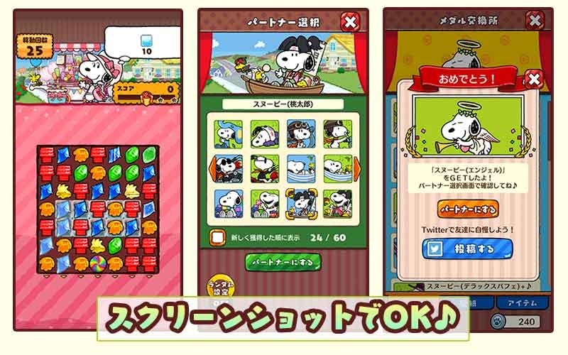 『スヌーピードロップス』のパートナーが写っているゲーム画面ならどんなものでもOK!
