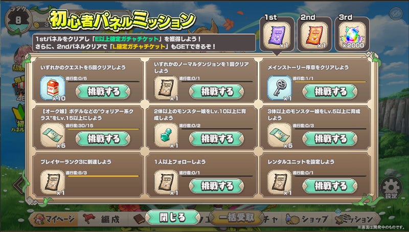 新たに「初心者パネルミッション」が実装されました。パネルに記載されているミッションを達成するごとに、さまざまな報酬を受取ることができます。さらに、すべてのパネルミッションをコンプリートすると、ガチャチケットや幻獣石などの報酬を入手することができます。詳しくはゲーム内のお知らせをご確認ください。