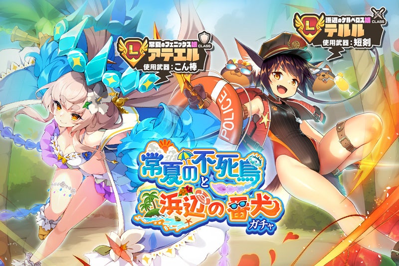 水着バージョンのモンスター娘「[常夏のフェニックス娘] アテエル」と「[浜辺のケルベロス娘] テルル」が登場する「常夏の不死鳥と浜辺の番犬ガチャ」を開催!本ガチャに新たに追加されたモンスター娘は、通常よりも高い排出確率が設定されています。また、本ガチャでは、1回ご利用ごとに「常夏の不死鳥と浜辺の番犬メダル」10枚をおまけとして獲得することができ、入手したメダルの枚数に応じ、専用の交換所でモンスター娘と交換することができます。詳しくはゲーム内のお知らせをご確認ください。