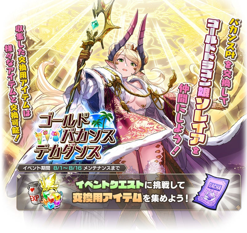 期間限定イベント「ゴールドバカンスデカダンス」を開催中!イベントクエストをクリアすると、「バカンスpt」が入手できます。バカンスptは、イベント専用の交換所で新たなモンスター娘「[ゴールドドラゴン娘] ソレイア」や、EXPミルクなど便利なアイテムと交換することができます。詳しくはゲーム内のお知らせをご確認ください。