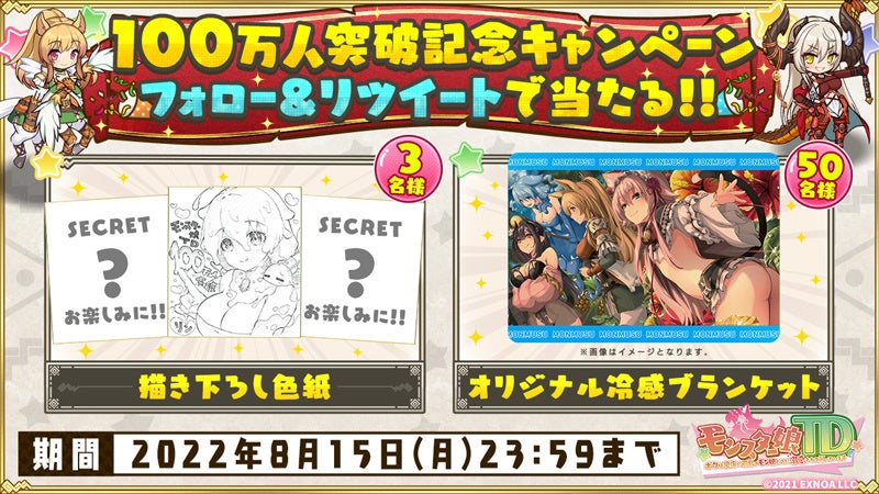 『モンスター娘TD』の登録者数100万人突破を記念して、公式Twitterにてキャンペーンを開催!『モンスター娘TD』公式Twitterアカウントをフォローし、該当の投稿をリツイートで応募完了となります。たくさんのご応募をお待ちしています!
