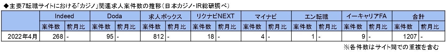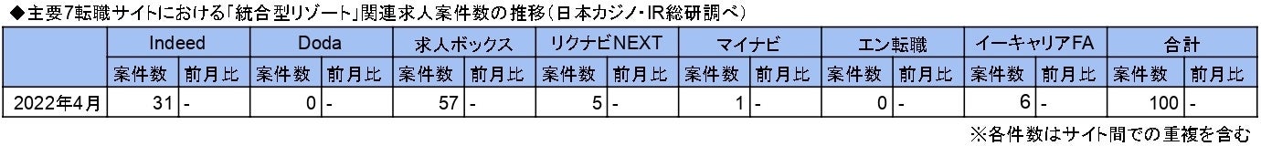 グローバルデジタルマーケティング企業のWindstorm Media Communications Ltd.(以下、当社)が運営する日本のカジノ・IR(統合リゾート)領域に特化したニュースメディア『日本カジノ・IR総研』(https://casino-tengoku.com/lab/)は、日本国内における日本カジノ・IR関連求人数の最新調査(2022年4月時点)をまとめましたので、結果を発表いたします。