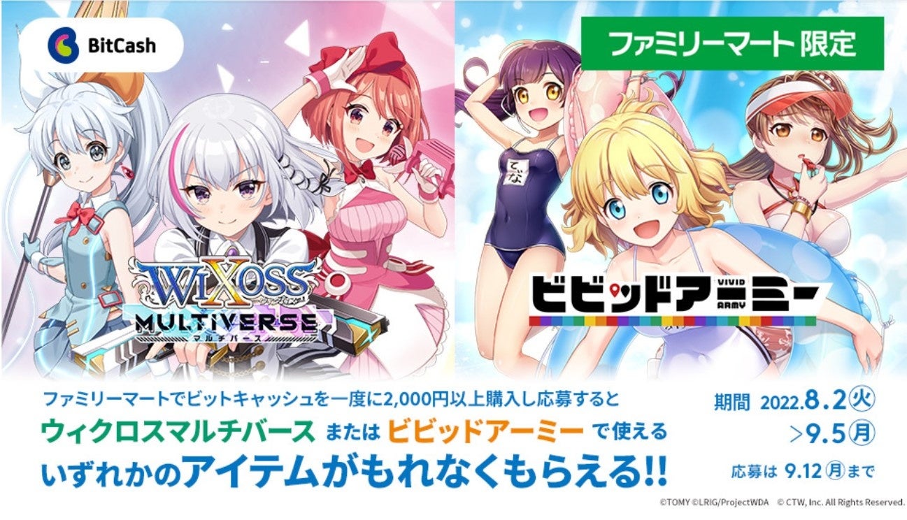 CTW株式会社は、2022年8月2日(火)よりファミリーマート限定でビットキャッシュまたはビットキャッシュカード購入者を対象に『ウィクロスマルチバース』または『ビビッドアーミー』で使えるアイテムがもらえるキャンペーンを開催します。