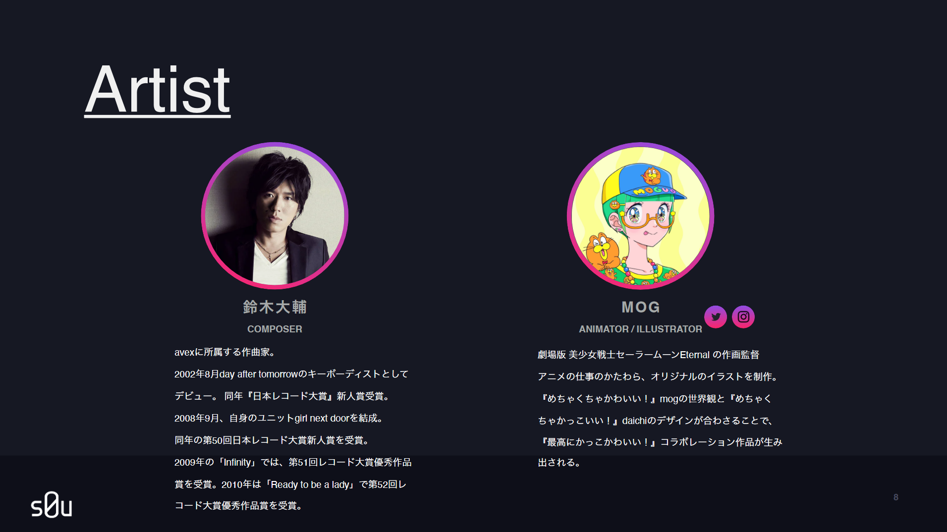 1.Singularity 0 Universeのメインクリエイターdaichiが描くキャラクターに鈴木大輔氏が制作した楽曲を組み合わせS0Uの世界観を反映させた。