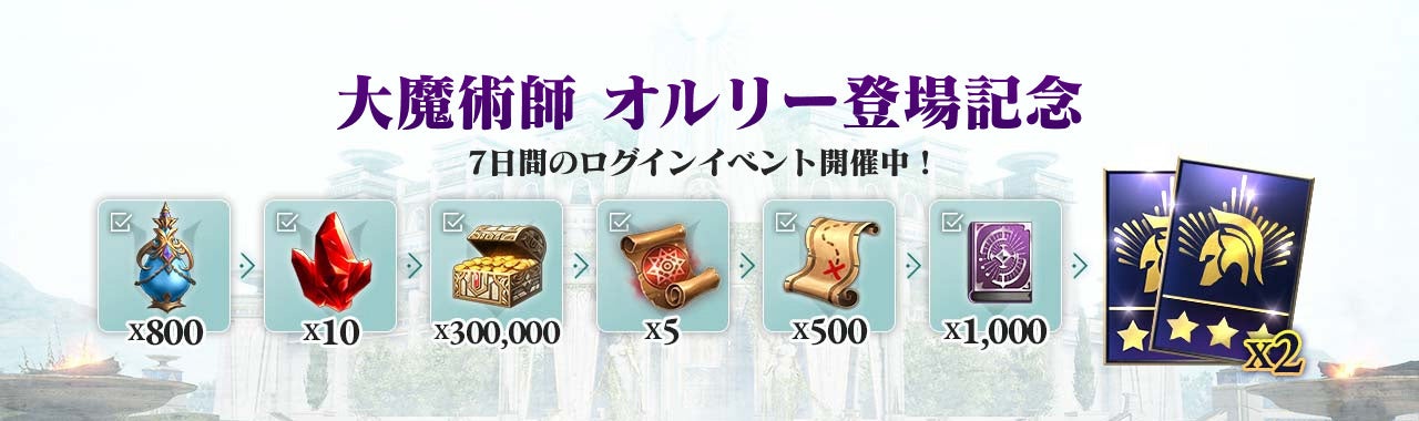 「大魔術師 オルリー」の参戦を記念して、英雄の成長などに役立つ様々な報酬を獲得することができる下記のイベントを開催いたします。