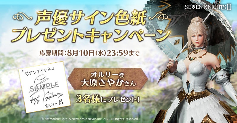 キャンペーン期間中に、『セブンナイツ2』公式Twitter(https://twitter.com/Sena2_JP)をフォローのうえ、キャンペーンツイートをリツイートしていただいた方の中から抽選で、大原さやかさんの直筆サイン色紙を各3名様にプレゼントいたします。