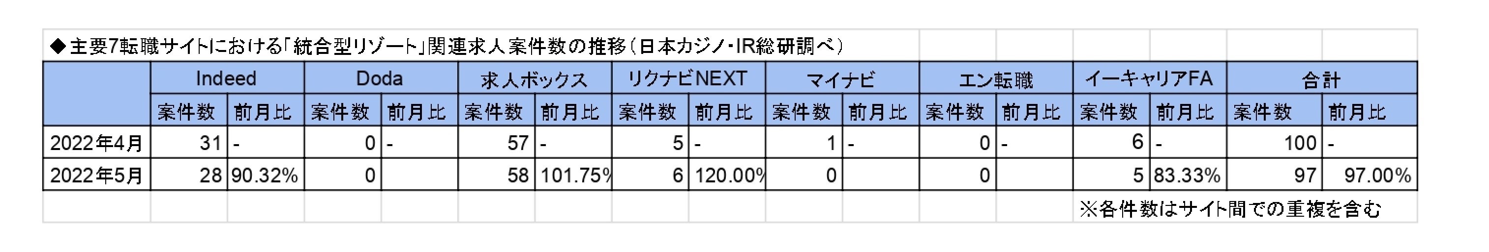 グローバルデジタルマーケティング企業のWindstorm Media Communications Ltd.(以下、当社)が運営する日本のカジノ・IR(統合リゾート)領域に特化したニュースメディア『日本カジノ・IR総研』(https://casino-tengoku.com/lab/)は、日本国内における日本カジノ・IR関連求人数の最新調査(2022年5月時点)をまとめましたので、結果を発表いたします。