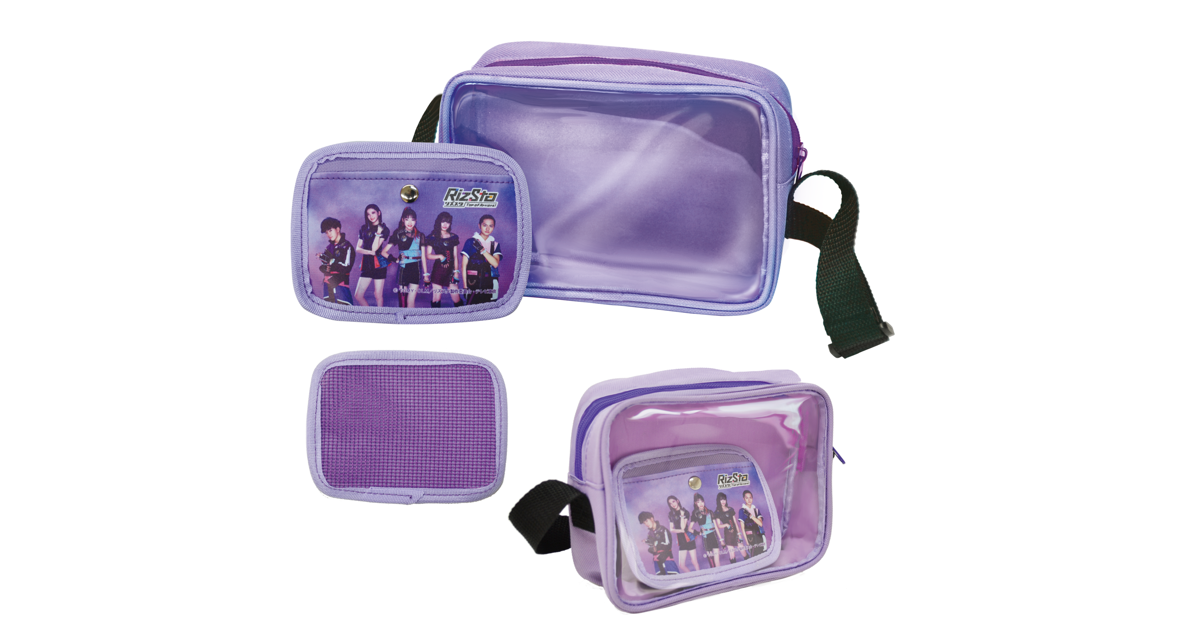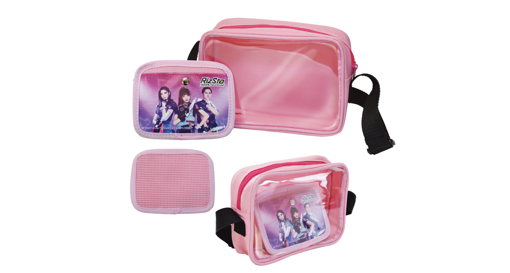片面がクリア使用になった透け感が可愛いショルダーバッグ。そこから覗くリズスタメンバーがプリントされたポーチが映えます。ポーチにはICカードやヘアピンなどの小物が入り、裏面のメッシュ素材には缶バッジも取り付け可能。