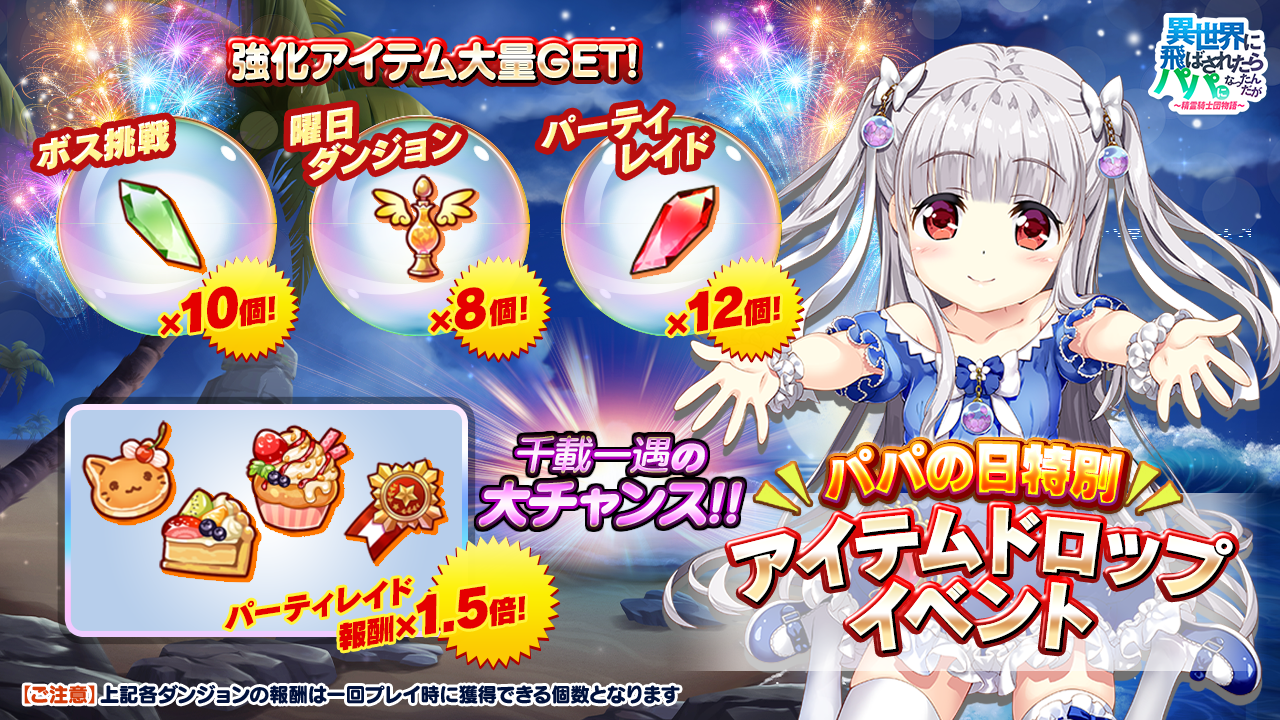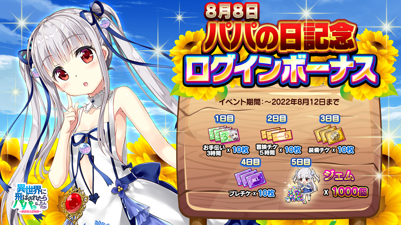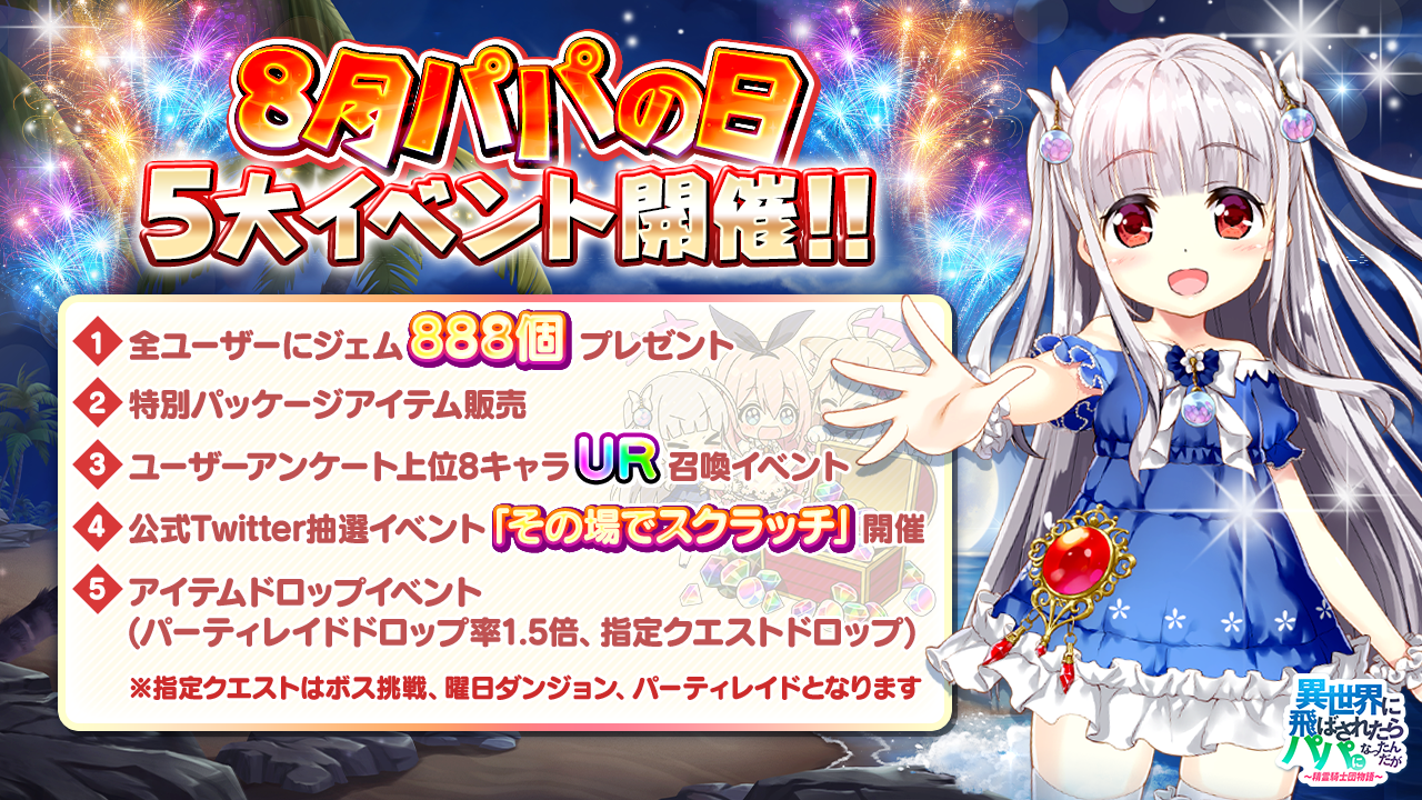 8月8日のパパの日では、 パパの日恒例の全ユーザーにジェム888個プレゼント、 1日限定のパパの日パッケージの販売、 アイテムドロップイベント、