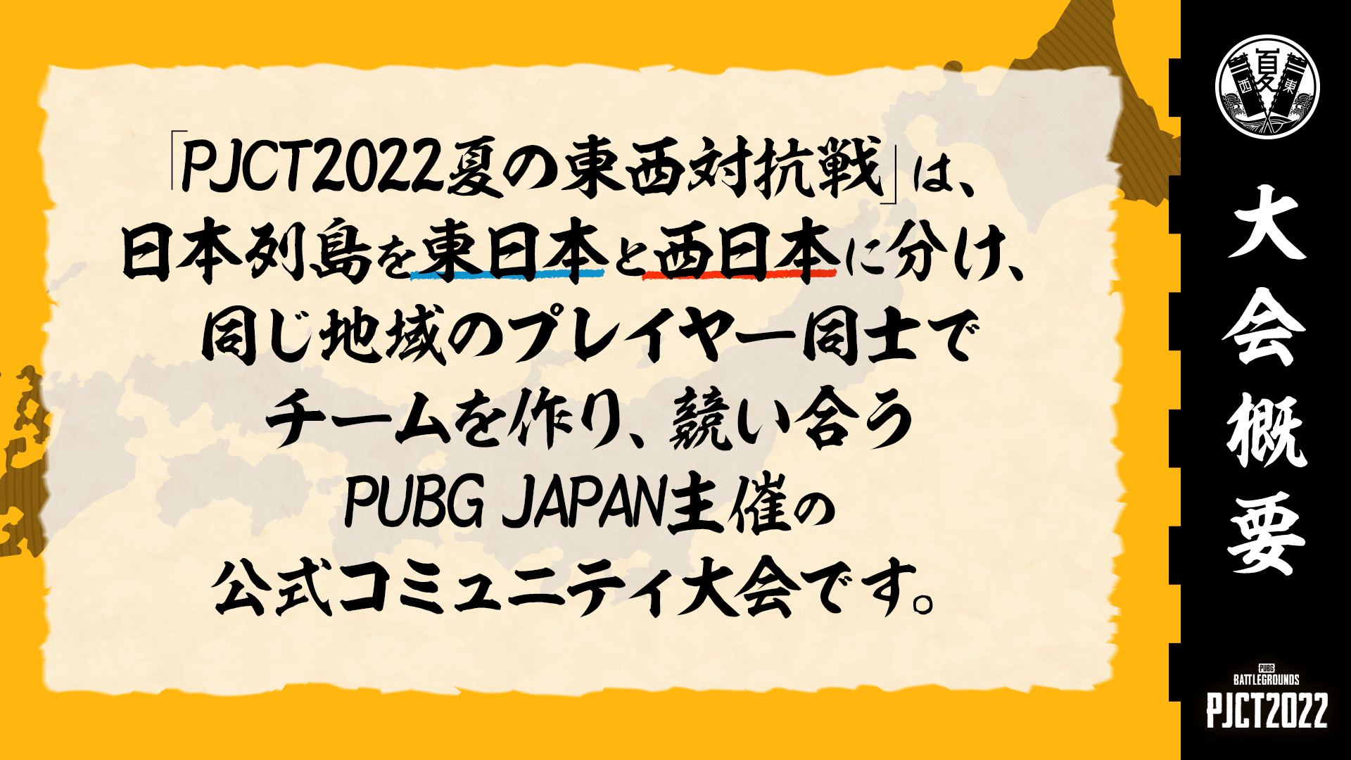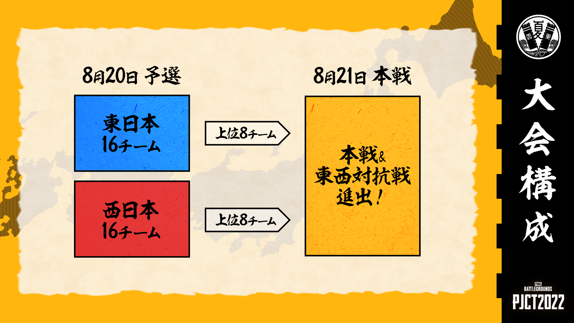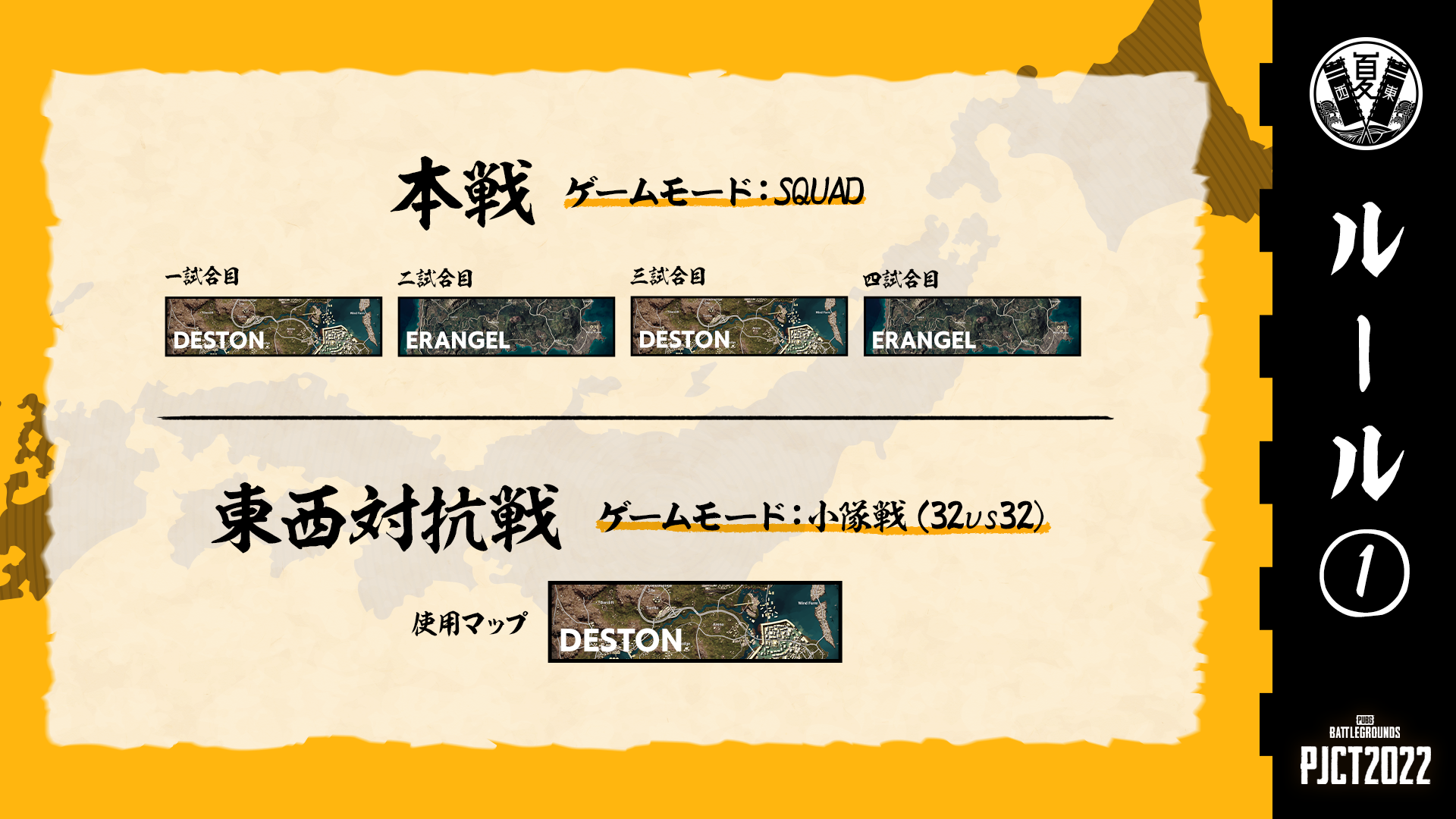 夏の東西対抗戦では、日本列島を東日本と西日本で分けてオンラインで実施されます。プレイヤーの皆さんは、同じ地域のプレイヤー同士で4人一組のSQUADでチームを組んで頂き、予選へエントリーしていただきます。また今回は1名からでもエントリーを受け付けており、この場合は運営側でほかのプレイヤーの方とチームを組みます。