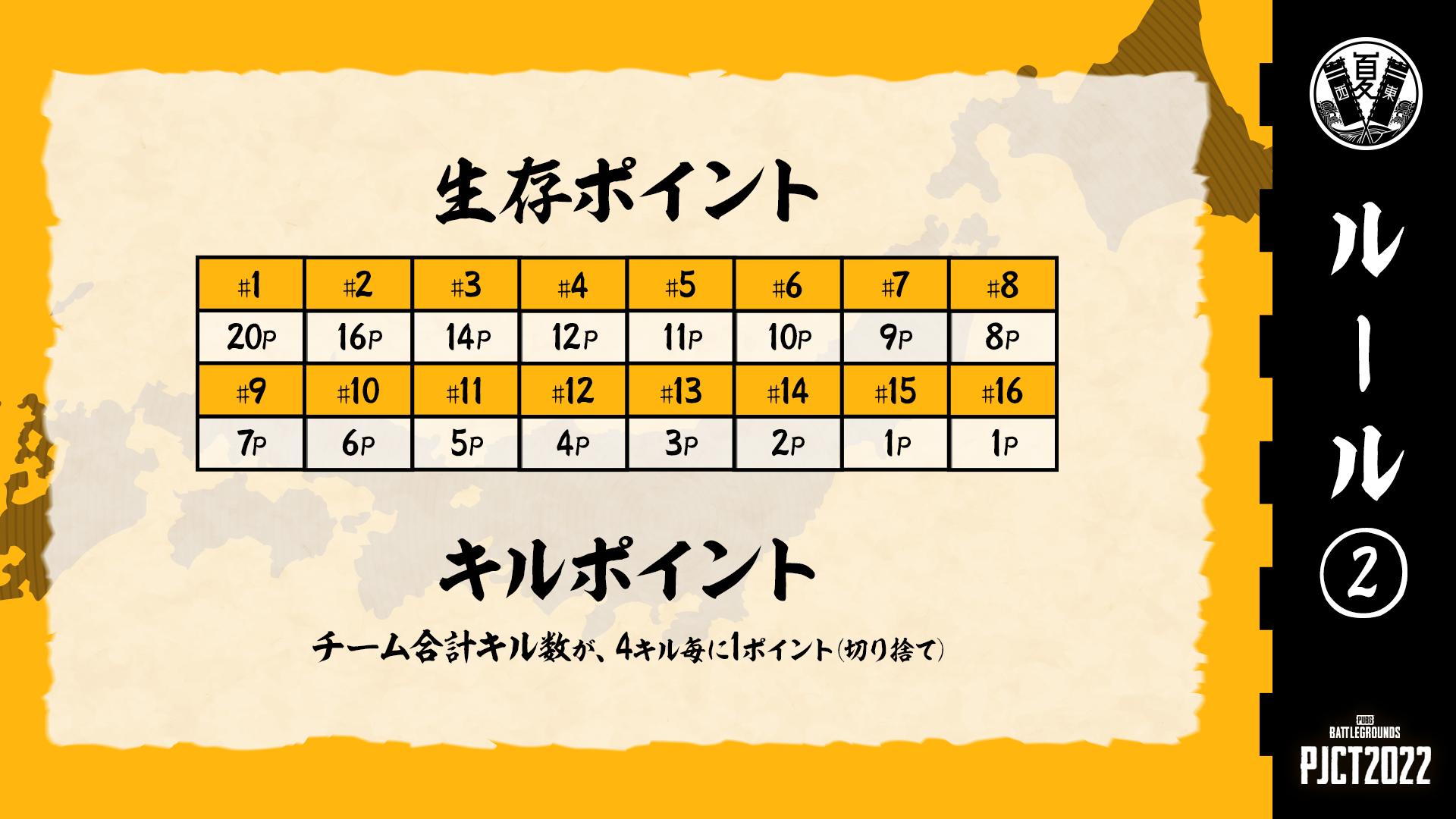 – 1. 生存順位ポイントとキルポイントを合計した総合獲得ポイントが高いチーム