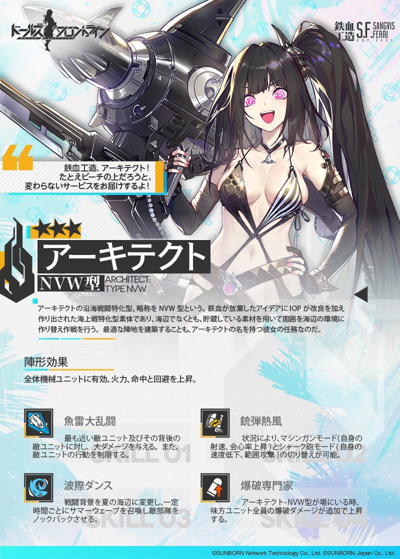 株式会社サンボーンジャパンは、スマホ向け戦略型シミュレーションゲーム『ドールズフロントライン(以下、「ドルフロ」)』において、強力な敵対勢力を捕獲できる「捕獲作戦」に新たな区域「SPzh3000海戦プラットフォーム」と★3ユニット「アーキテクト-NVW型」が登場することをお知らせいたします。また、過去の水着イベントの復刻など、そのほかのゲーム内の情報についても合わせてお知らせいたします。
