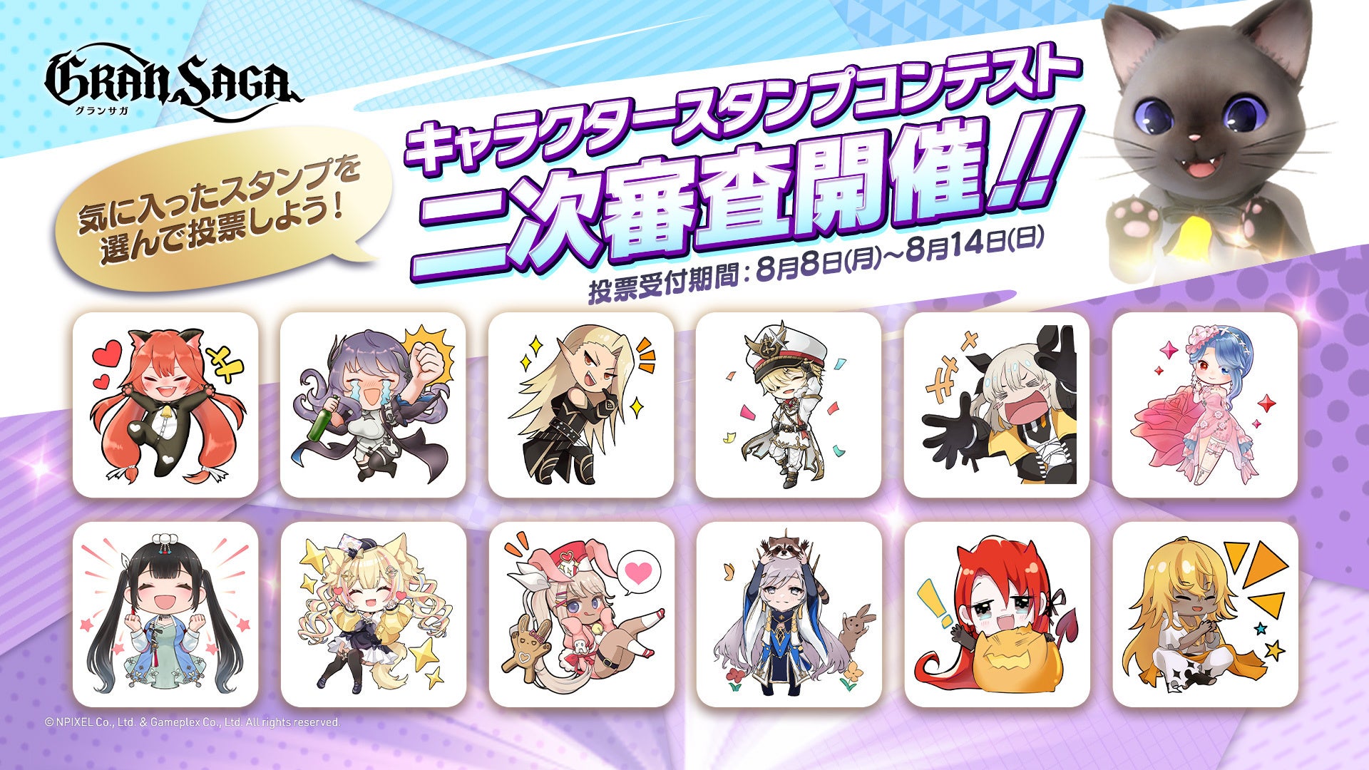 株式会社NPIXELは、シネマティックオンラインRPG 「グランサガ(Gran Saga)」(運営:株式会社GAMEPLEX) の公式Twitterにて、6月に開催していたイベント「キャラクタースタンプコンテスト」の2次審査を本日より開始いたしました。最優秀特別賞受賞者には賞金10万円のほか、スタンプのイラストはゲーム内のキャラクタースタンプとして実装いたします。