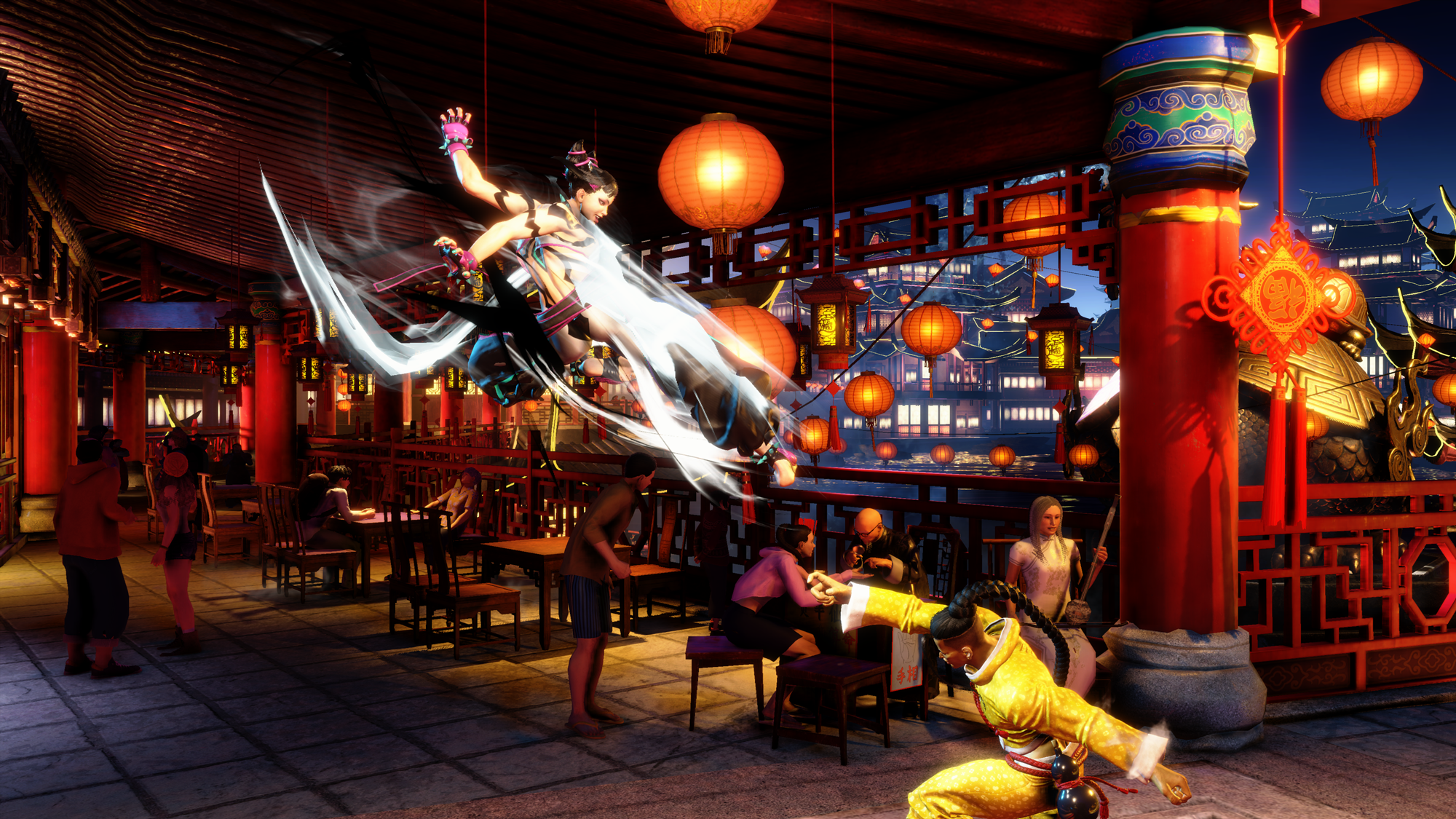 新発表されたステージ「TIAN HONG YUAN」は、夜が訪れた繁華街にちょうちんが灯り、人々が各々に楽器の演奏や談笑を楽しむ幻想的な空間。格闘家達のバトルを盛り上げる事間違いなしだ。