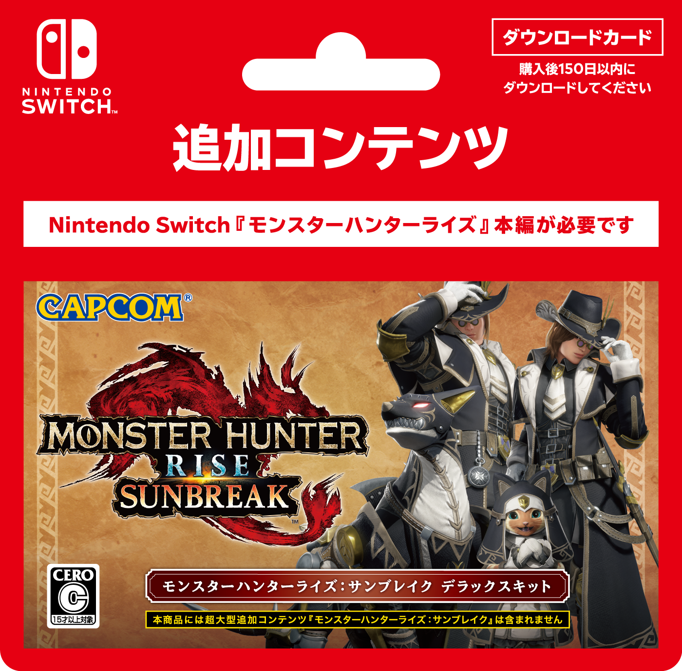 また、ハンターライフを華やかに彩る、おすすめのダウンロードコンテンツをセットにした「モンスターハンターライズ:サンブレイク デラックスキット」のダウンロードカードも販売中です。