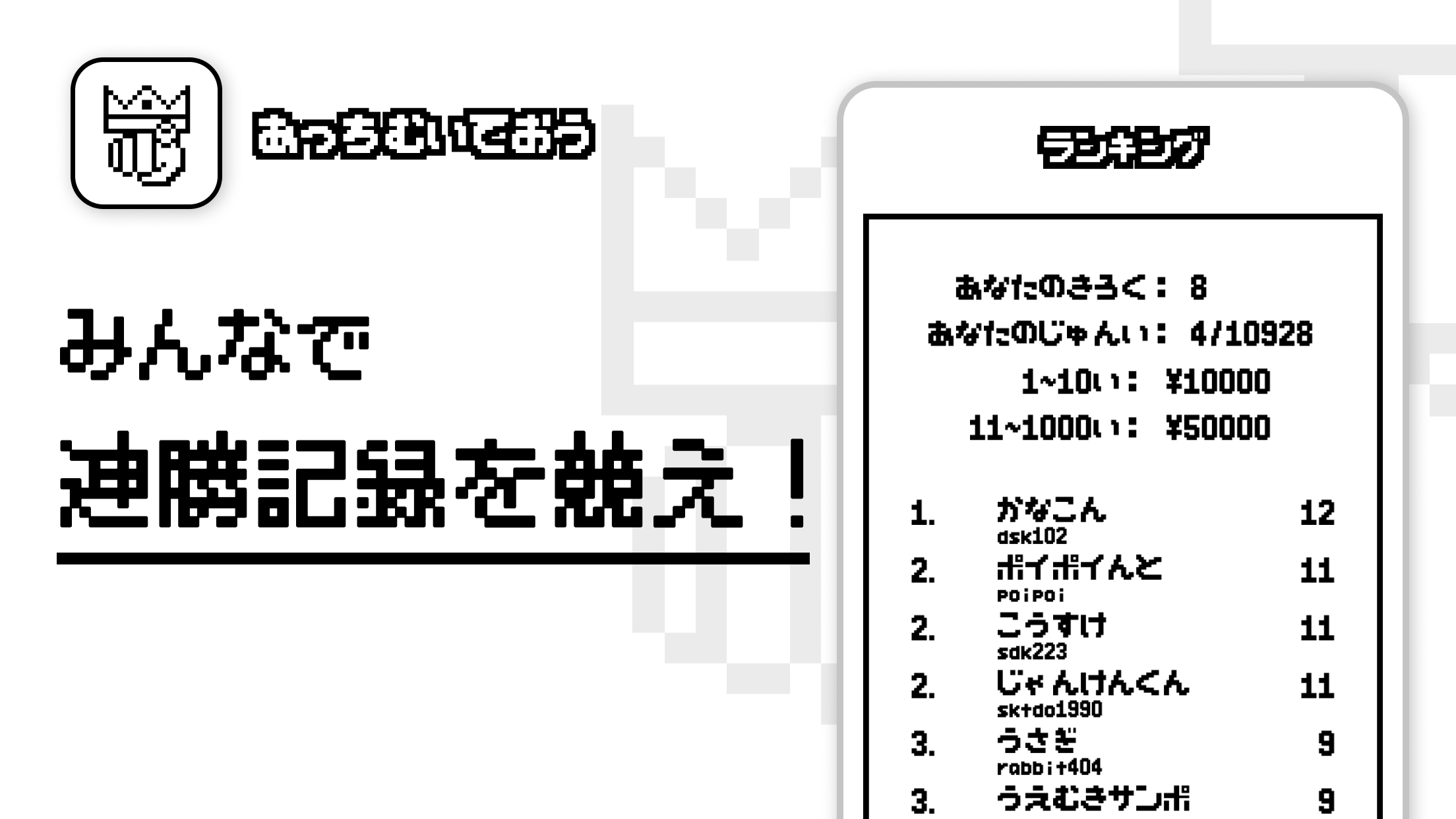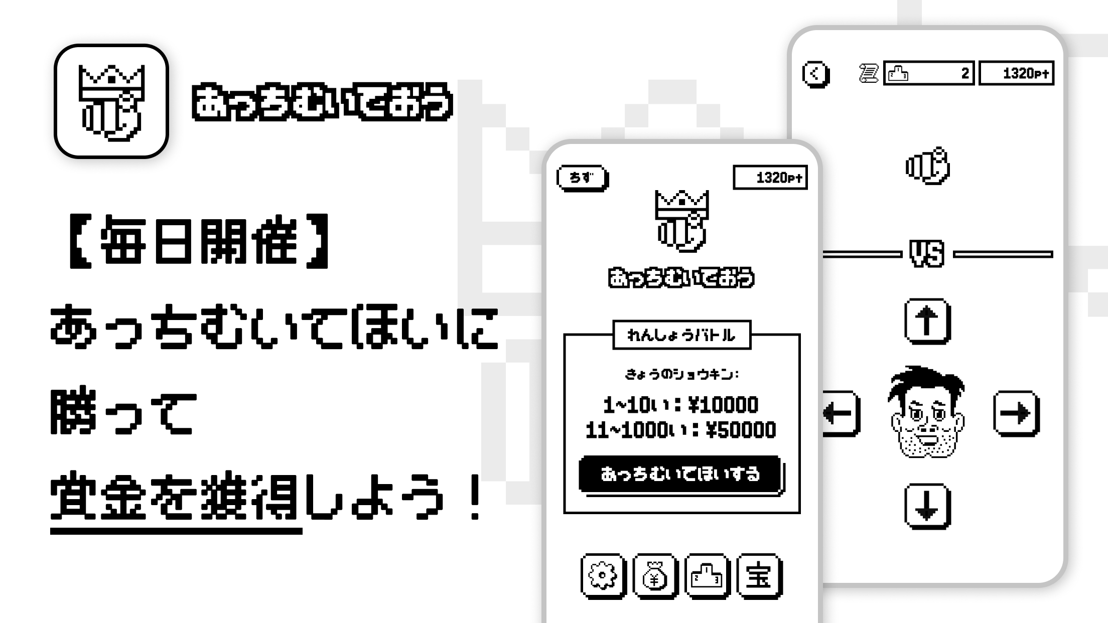 「あっちむいてほい」に勝つだけでお⾦・懸賞品が手に入る、毎⽇無料で何回でも挑戦ができる完全無料あっちむいてほいアプリ!