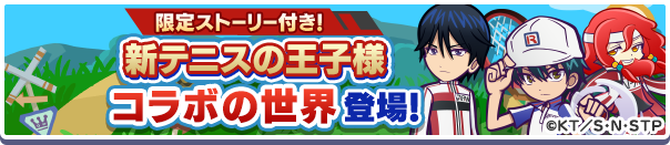 内容:コラボ期間中、「ストーリー」に期間限定で専用ワールド「新テニスの王子様 コラボの世界」が出現。『新テニスの王子様』キャラクターたちが登場するコラボ限定ストーリーを楽しめます。