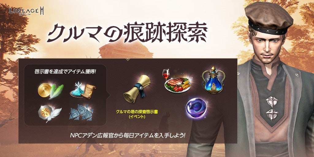 期間中、アデン大陸の各村に出現するイベント NPC「アデン広報官(イベント)」に話しかけることで、アデナを使用して