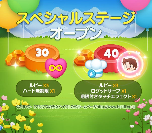 期間中、ゲーム内にハイジたちが暮らすアルプスの大自然をイメージしたオリジナル料理が楽しめるコラボ限定デザインのスペシャルステージが登場します。ステージ12をクリアすると報酬としてゲームアイテムやコラボバディ「ハイジ」が獲得できます。