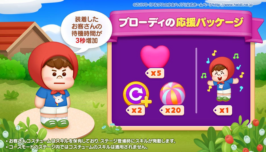 本コラボレーションでは、「ハイジ&ユキちゃん」や「クララ&ヨーゼフ」など、4種類のコラボバディが登場するほか、コラボ限定デザインのスペシャルステージでアルプスの大自然をイメージしたオリジナル料理が楽しめます。さらに、ステージに登場するお客さんに装着すると、ゲームプレイに役立つ効果を発動する『アルプスの少女ハイジ』モチーフのコスチュームアイテムが手に入るパッケージを販売します。