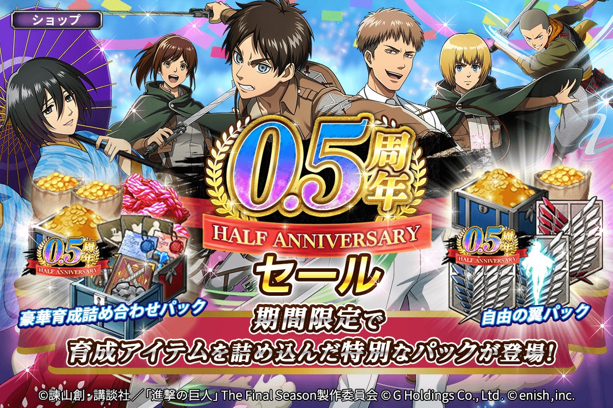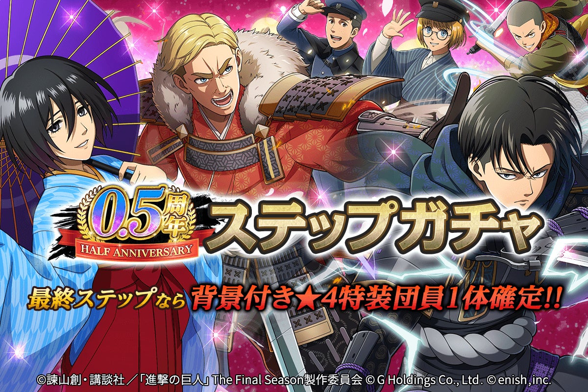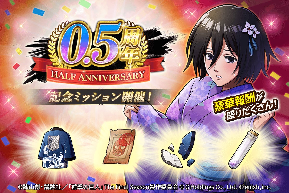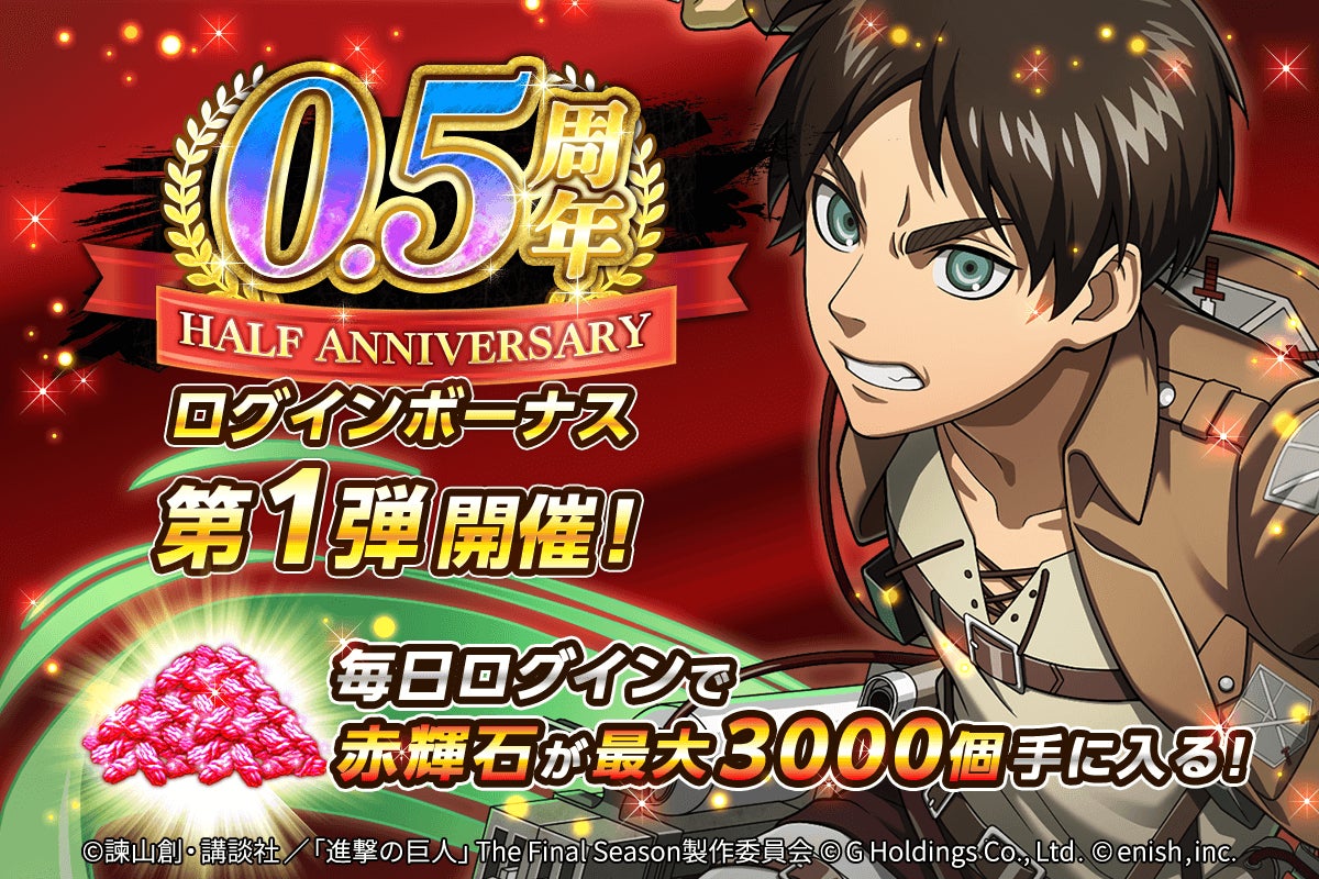 株式会社enish(本社:東京都港区、代表取締役社長:安徳 孝平、以下enish)は、アニメ『進撃の巨人』のスマートフォンゲーム最新作「進撃の巨人Brave Order」にて、2022年8月11日(木)より、ブレオダリリース0.5周年を記念して豪華キャンペーンを開催!毎日ログインで最大ガチャ25連分相当の赤輝石がもらえちゃうログインボーナスや0.5周年ステップアップガチャ、報酬や経験値が2倍になるキャンペーンも開催!更に0.5周年限定コンテンツも実装!その他、最新情報はゲーム公式サイト・ゲーム公式Twitterアカウントにて随時公開して行きますので、ぜひご覧ください。